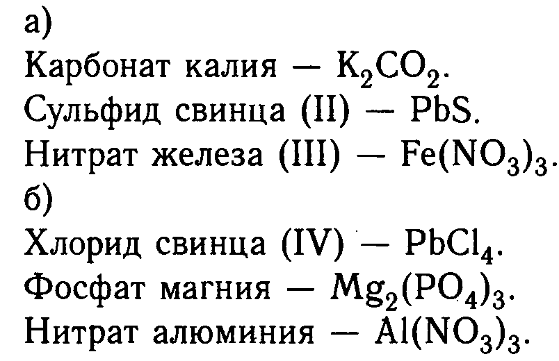 а) карбоната калия, сульфида свинца (II), нитрата железа (III); б) хлорида свинца (IV), фосфата магния, нитрата алюминия.