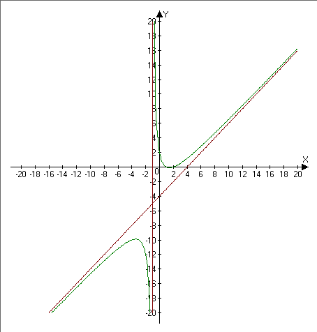 7)график- вложение(зеленая линия-график функции,красная-асимптоты)