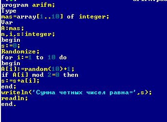 составте программу, которая заполняет масив а[1..10] случайными целыми числами в диапазоне от 1 до 10 и находит сумму элементовс четными значениями