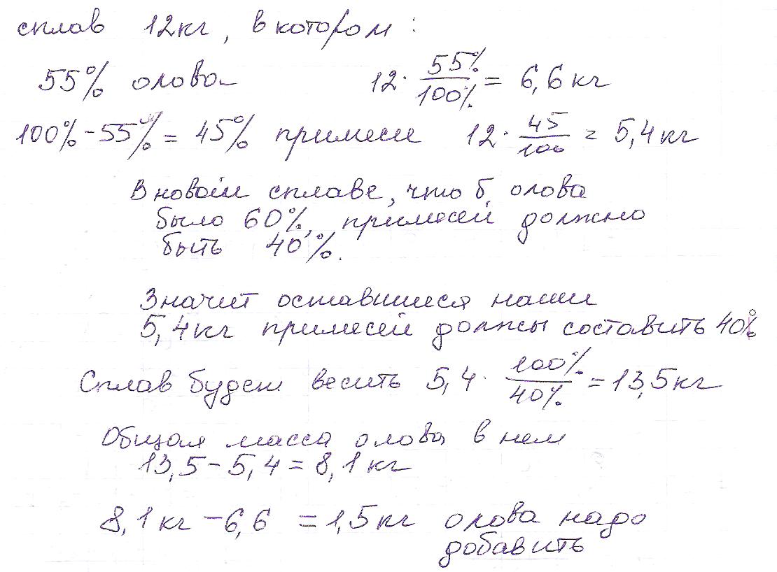 Сколько чистого олова надо добавить к 12 кг сплава,содержащего 55% олова чтобы в новом сплаве было 60% олова??????????