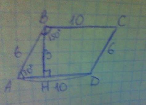 в сторону параллелограмма 10 и 6 см а угол между ними 150 градусов найдите площадь этого палелограмма