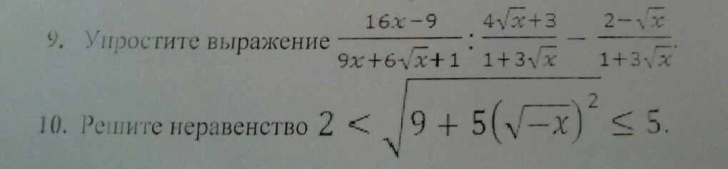 frac{16x-9}{9x+6 sqrt{x} +1}: frac{4 sqrt{x} +3}{1+3 sqrt{x} }  - frac{2- sqrt{x} }{1+3 sqrt{x} } =\= frac{(4 sqrt{x})^2 -3^2}{(3 sqrt{x} +1)^2}* frac{1+3 sqrt{x}}{4 sqrt{x} +3}  - frac{2- sqrt{x} }{1+3 sqrt{x}} =\= frac{4 sqrt{x} -3}{3 sqrt{x} +1}-frac{2- sqrt{x}}{1+3 sqrt{x}}=\=frac{4 sqrt{x} -3-2+ sqrt{x}}{3 sqrt{x} +1}=\=frac{5 sqrt{x} -5}{3 sqrt{x} +1}