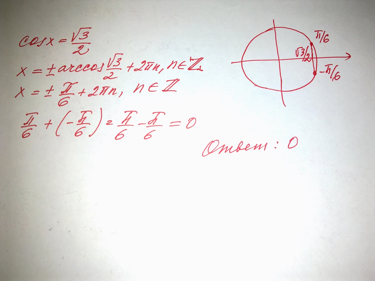 Найдите сумму наименьшего положительного и наибольшего отрицательного корней уравнения cosx=√3/2