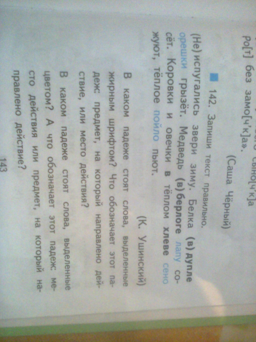 Не испугались звери зиму. Белка в дупле (Пред. п.) орешки (Вин. п. )грызет. Медведь в берлоге (Пред. п.) лапу (Вин. п.) сосет. Коровки и овечки в теплом хлеве (Пред. п.) сено (в. п.) жуют, теплое пойло (в. п.) пьют.