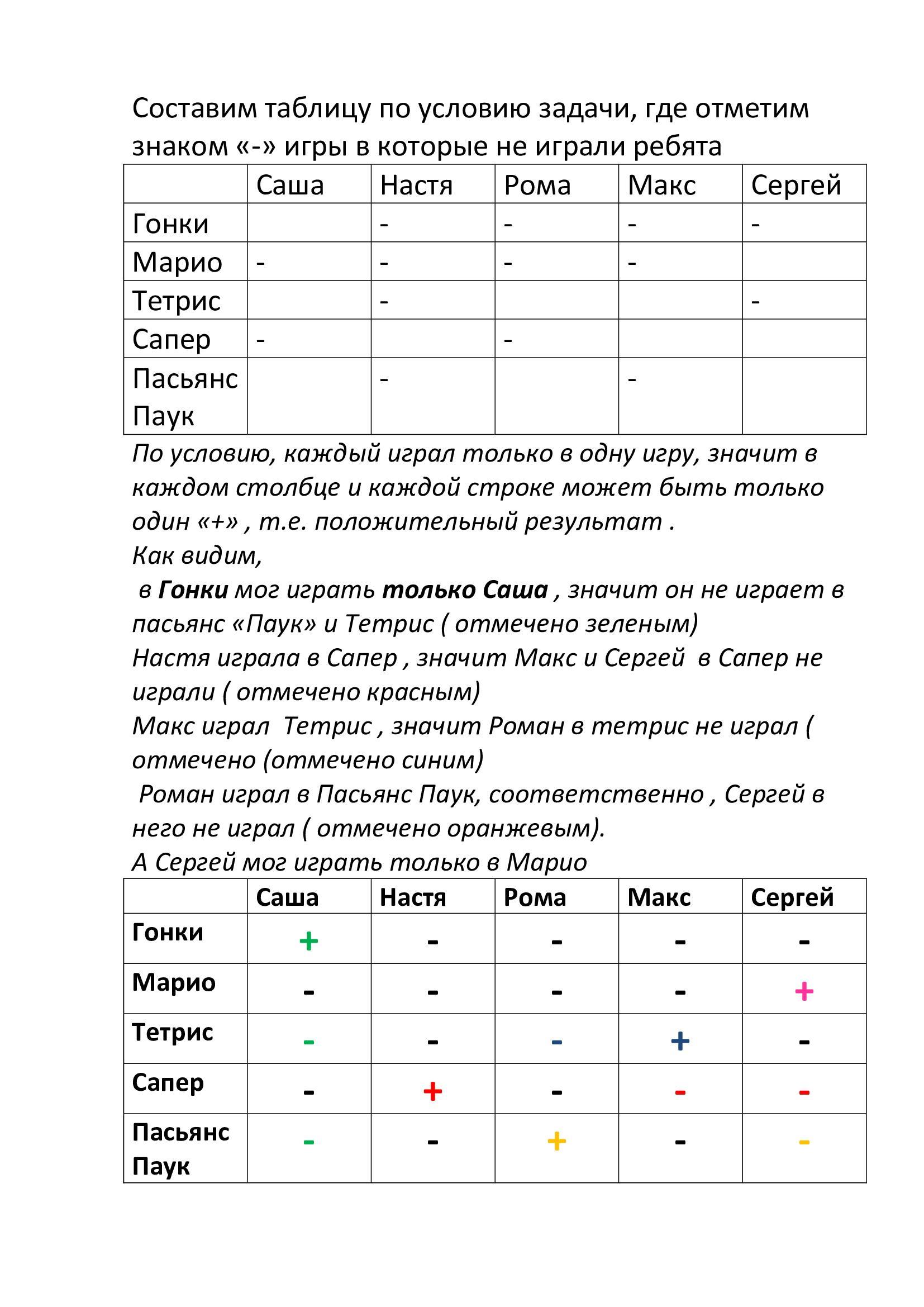 В компьютерном классе на уроке информатики,во время отсутствие учителя,пять ребят-Максим,Настя,Саша,Рома,Сережа,-отвлеклись от нужной работы и стали играть в такие игры:пасьянс "Паук",гонки,сапер,"Марио",тетрис.Каждый из них играл только в одну игру.