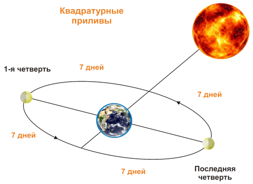 2 рис квадратурный прилив, наименьший прилив,силы солнца и луны действуют под прямым углом друг у другу