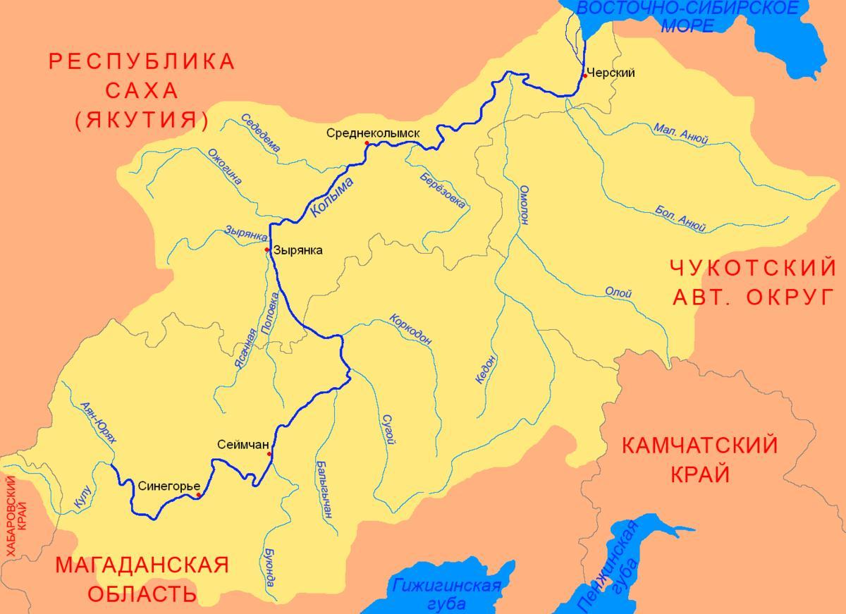 Исток реки Колымы-это слияние рек Кулу и Аян-Юрях в районе Охотско-Колымского нагорья.Координаты истока 62° с.ш. 147° в.д. Устье реки впадает в Восточно-Сибирское море.Координаты устья 69° с.ш. 161° в.д.Река течёт на север-северо-восток.