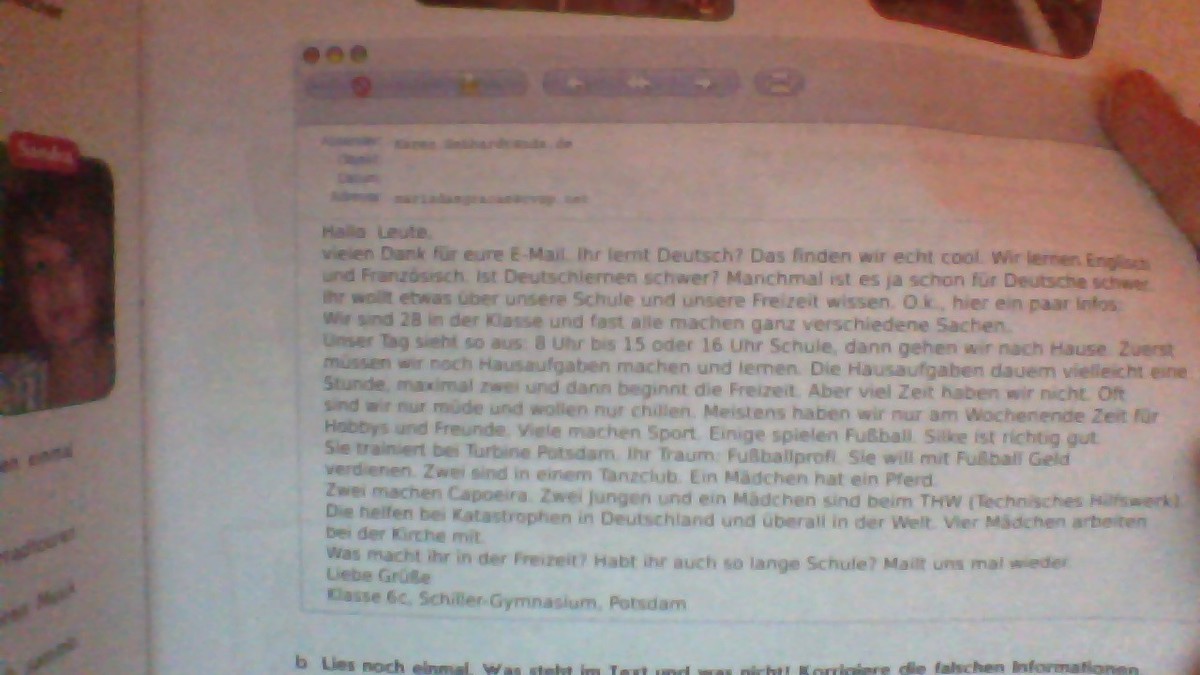 Спасибо большое за твое письмо.Ты учишь немецкий?Мы считаем,что это хорошо, хотя учим английский и французский..Учить немецкий сложно?Иногда наверное это так. Вы посвящаете школе все свободное время.Хорошо, вот некоторые особенности нашей жизни :нас в классе 28 и мы занимается совершенно разными вещами.Каждый день одно и тоже: до 3-4 школа, потом домой и делать домашнее, которое занимает примерно час, а дальше свободное время.Но этого времени не достаточно для друзей и хобби.Многие занимаются спортом.Например футболом,двое танцуют, а одна девочка ездит на лошади.Двое парней и двое девушек ходят в церковную школу и занимаются благотворительностью.Помогают людям, пострадавшим от катастроф в Германии и по всему миру.