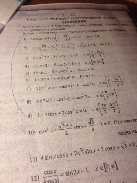 5cos2x+7*cos(3π/2-x)+1=0, так как cosx - функция четная