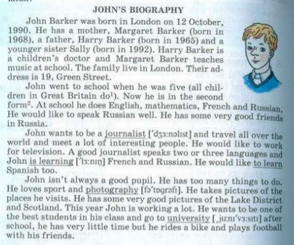 Джош не всегда хороший ученик. Он любит спорт и фотографирование. Он фотографирует места, которые посещает. Он сделал очень хорошие фотографии Озерного края и Шотландии. В этом году Джош активно работает. Он хочет стать лучшим учеником в своем классе и пойти в институт после школы, у него не так много времени, но он катается на велосипеде и играет в футбол со своими друзьями.