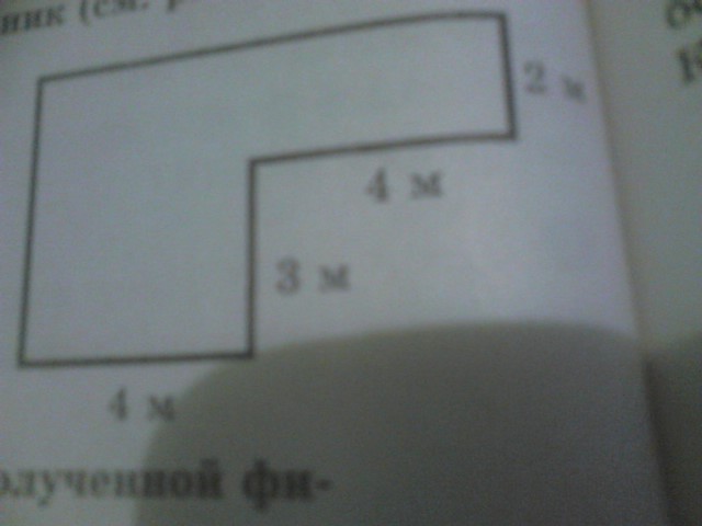 Нижняя сторона = 7-3=4 м Правая сторона = 3+2=5 м Периметр = 7+5+4+2+3+3= 24 м Площадь = Площадь пластины - Площадь вырезанного прямоугольника Пл. Пластины = 7*5 = 35 м. кв. Пл. Вырез. = 3*2 = 6 м. кв. Площадь = 35-6 = 29 м. кв. Краски надо 29*20 = 580 г