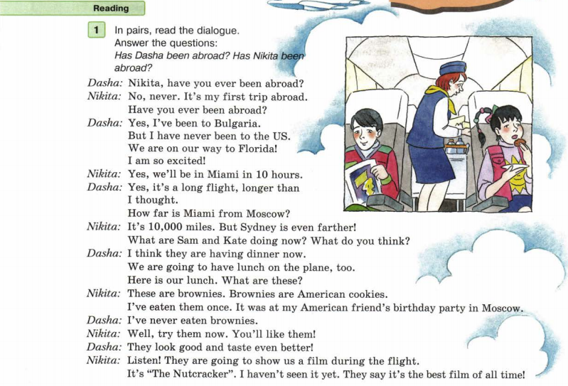 Даша: Я думаю,обедают. Мы тоже собираемся пообедать здесь,в самолёте. Вот наш ланч. Что же здесь?