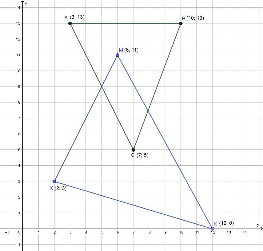 А(3,13), В (10,13), С (7,5), Х (2,3), М (6,11), К (12,0)