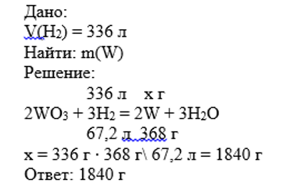 Какая масса вольфрама образовалась, если прореагировало 336 литров водорода? WO₃+3H₂ ₋₋₋ W+3H₂O (W-вольфрам) Заранее спасибо