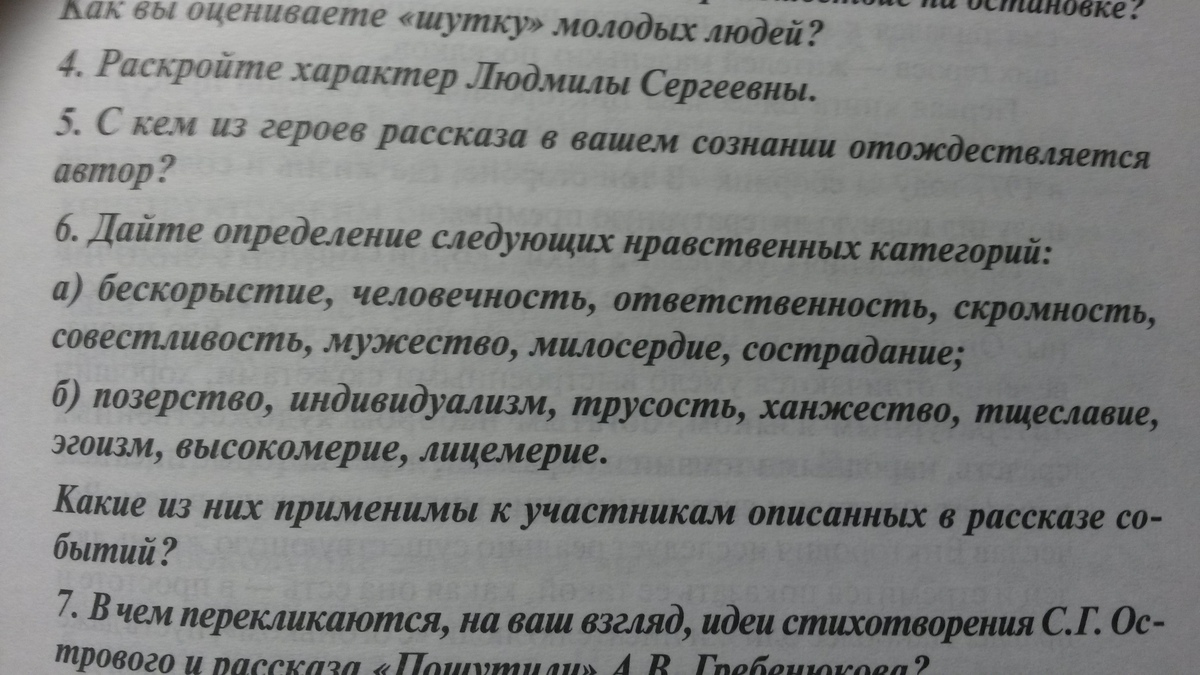 а)бескорыстие-это помощь или услуга,оказываемая кому либо без всякой выгоды для того человека,который оказывает эту помощь.человечность-это комплекс высоких нравственных качеств,применимых только человеку.Ответственность-субъективная обязанность отвечать за поступки и действия, а также их последствия.Скромность-это черта характера человека,выражающаяся в умеренности во всех требованиях, равнодушии к богатству и роскоши, не стремлении первенствовать, показывать себя.Совестливость-способность человека, критически оценивая свои поступки, мысли, желания, осознавать и переживать свое несоответствие должному как собственное несовершенство.Мужество-этическая добродетель, характеризующая нравственную меру в преодолении страха; одна из четырех кардинальных добродетелей античности.Милосердие-готовность из сострадания оказать помощь тому, кто в ней нуждается.Сострадание- это чуткость и внимательность к окружающим, неподдельное уважение к их интересам и их переживаниям.б)позерство-Притворство в поведении, манерах, словах; стремление принимать позу.Индивидуализм-самостоятельность, независимость личности от установок и мнений других людей. трусость-то характеристика поведения человека в определенной ситуации, выраженная отказом к какому-либо действию (поступку) по причине страха или каких-либо фобий.ханжество-показная (демонстративная) форма благочестия и набожности.тщеславие-стремление прекрасно выглядеть в глазах окружающих, потребность в подтверждении своего превосходства.эгоизм-поведение,целиком определяемое мыслью о собственной пользе.