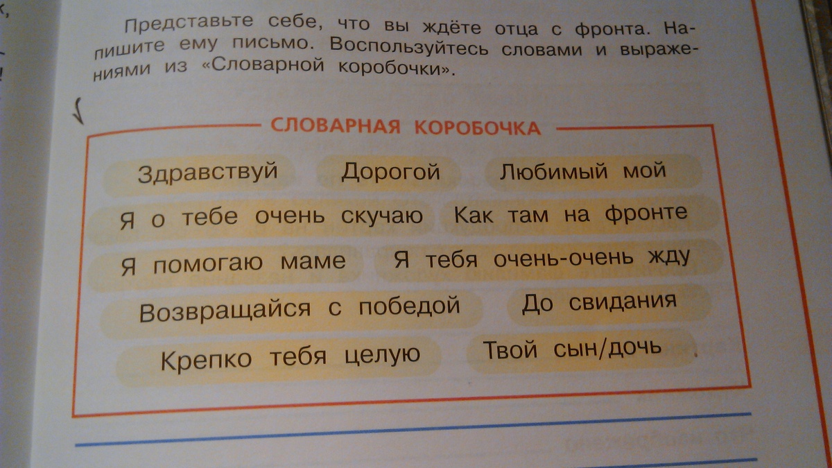 Вот задание и словарная коробочка!!!!! срочно нужно к завтрашнему дню!!!!!!!!!!!!! Заранее СПАСИБО!!!!!!!!!!!!!!!!!!!!!!!!!!! УМОЛЯЮ ПОМОГИТЕ :-( :'( Представьте себе, что вы ждёте отца с фронта. Напишите ему письмо. Аоспользуетесь словарной коробочкой!
