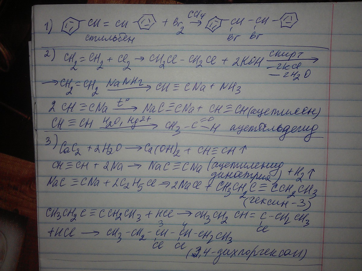 2)C2H4 + Cl2(CCl4) --> ? + KOH(спирт) --> ? + NaNH2 --> ? + H2O, H+, Hg2+ --> ?