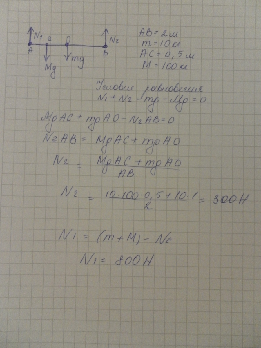 Два человека одинакового роста держат в горизонтальном положении за концы трубу длиной l = 2 м и массой m = 10 кг. На расстоянии d = 0,5 м от первого человека к трубе подвешен груз массой M = 100 кг. Определите силы, с которыми труба давит на плечи первого и второго человека. ОТВЕТЫ ИЗ ИНТЕРНЕТА НЕ ПРИНИМАЮТСЯ. МОЖЕТЕ НЕ ГУГЛИТЬ .