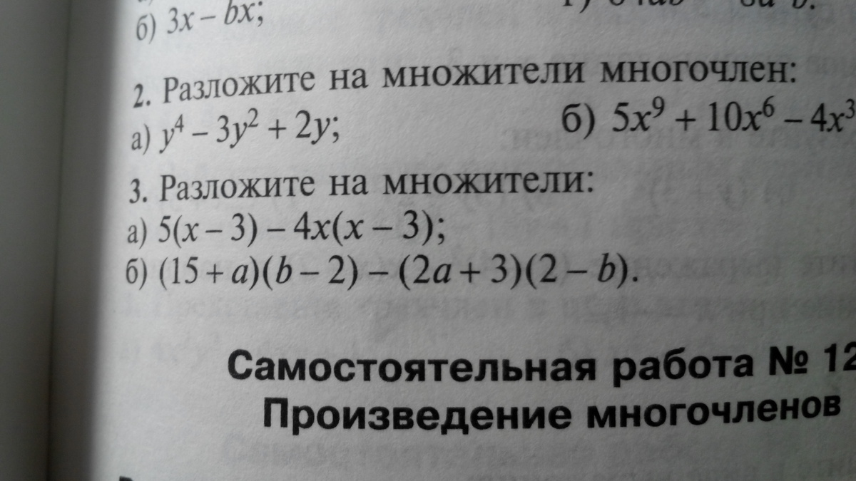 2) a)y^4-2y^2-y^2+2y . y^2(y^2-2)-(y^2-2) . (y^2-2)(y^2-1)= (y^2-2)(y-1)(y+1) 3) a) (x-3)(5-4x) b) (b-2)(15+a+2a+3) = (b-2)(18+3a)= 3(b-2)(6+a)