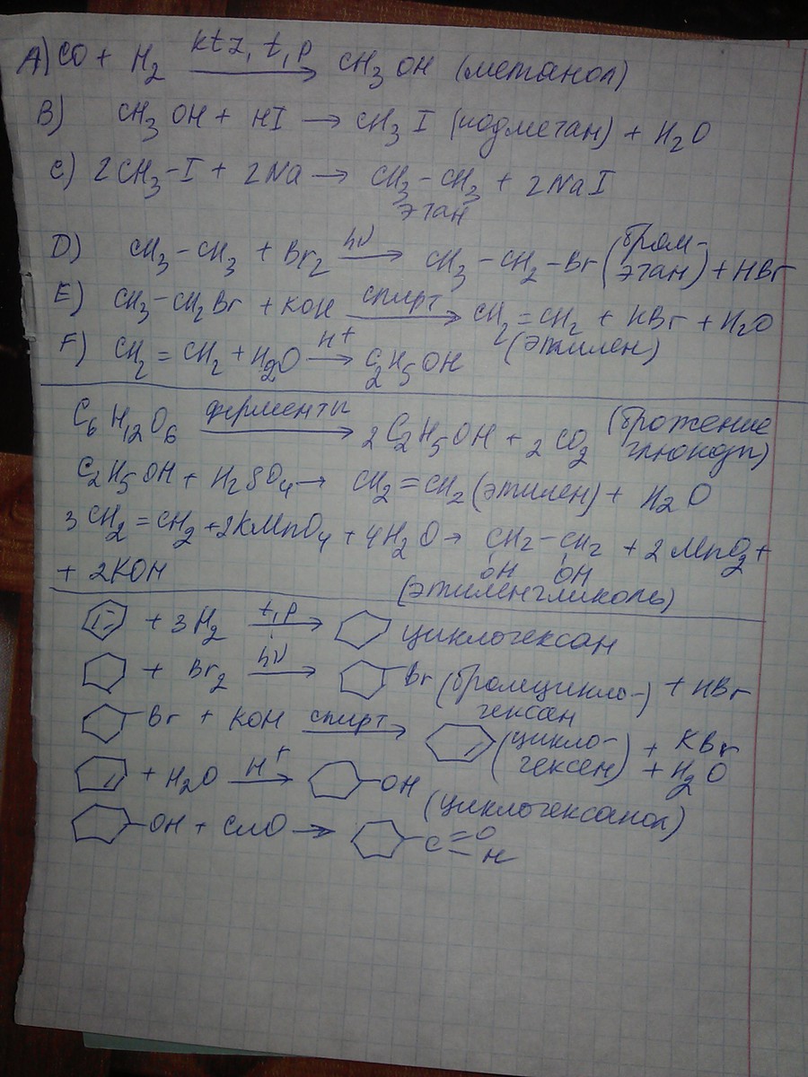 3)Бензол --(H2,Pt,t)-- A --(Br2, hv)-- B --(KOH(спирт р-р.),t)-- C --(H2O,H)-- D --(CuO,t) E.