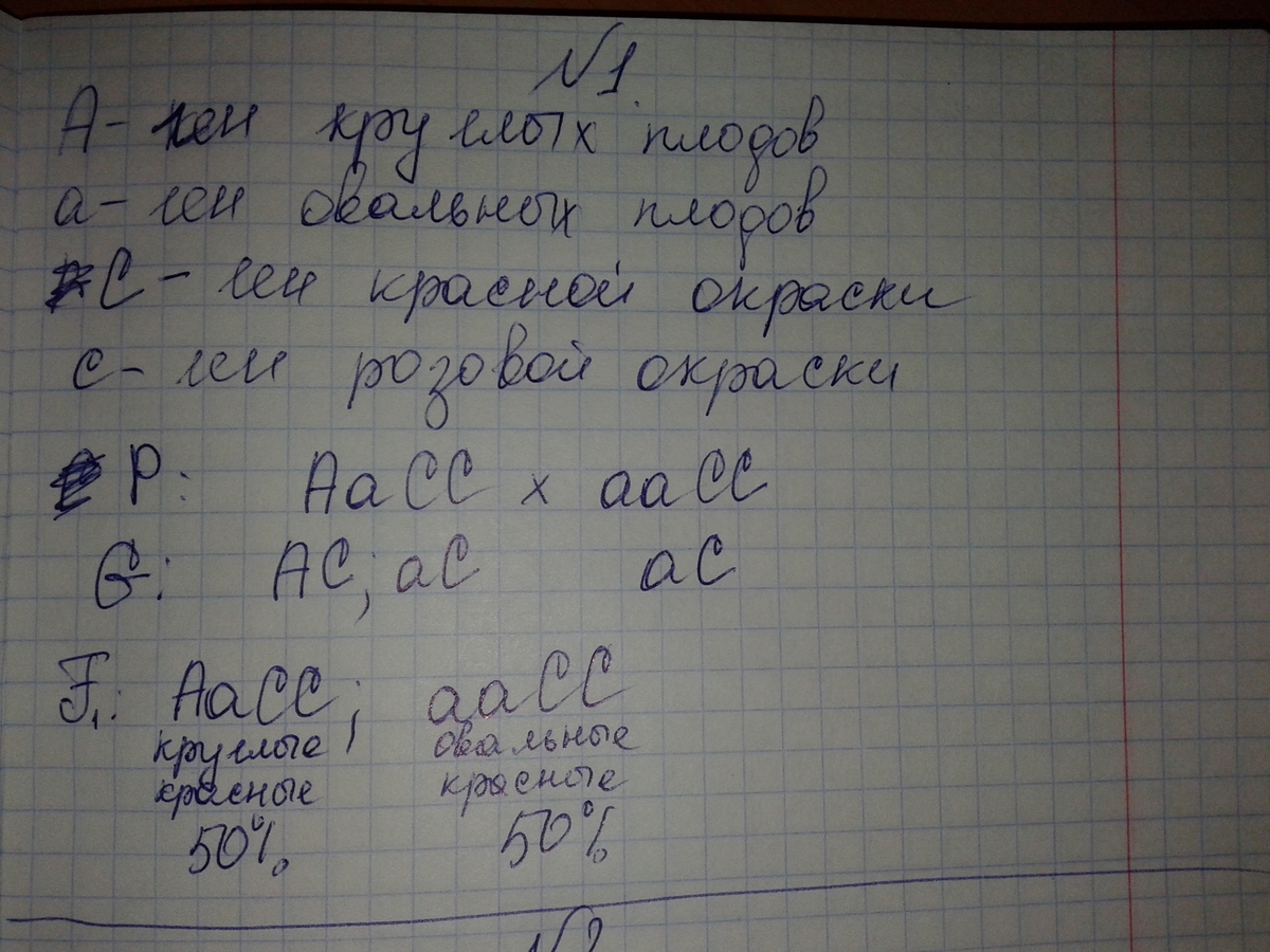 1 у томатов круглая форма плодов (А) доминирует над овальной (а) красная окраска плодов (С) - над розовой (с) при скрещивание в потомстве 50% растений дали красные круглые плоды 50%- красные овальные плоды каковы генотипы родителей и гибридов?