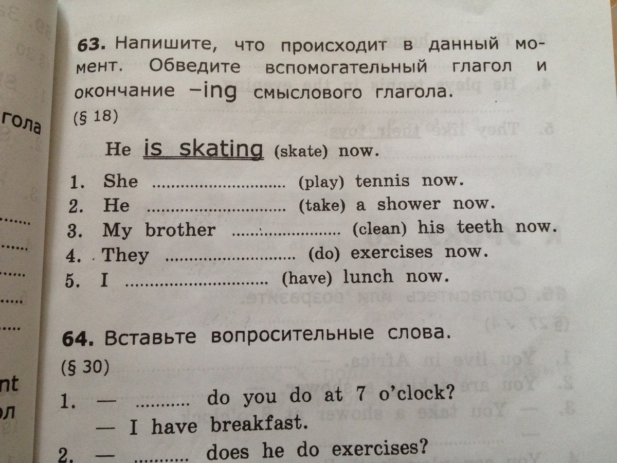 Напишите, что происходит в данный момент. Обведите вспомогательный глагол и окончание-ing смыслового глагола.