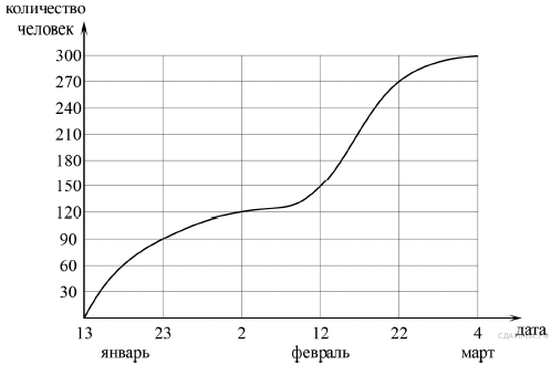На графике показано, сколько человек зарегистрировалось с 13 января по 4 марта 2013 года в качестве участников конференции. По горизонтали указаны числа месяцев, а по вертикали — количество человек.