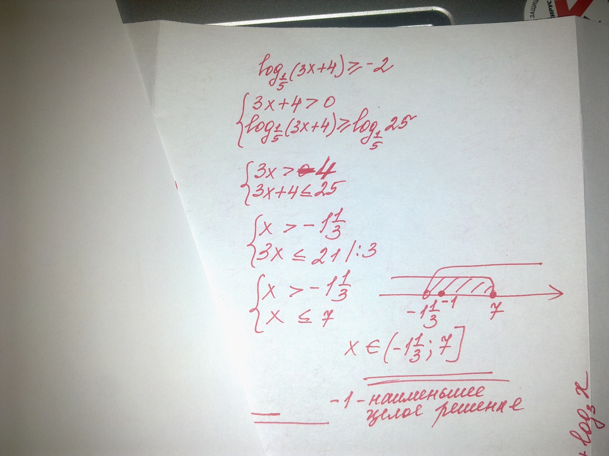 ПОМОГИТЕ ПОЖ!!! Решите неравенство: log по основанию1/5 (3x+4)>=-2 и укажите его наименьшее целочисленное решение