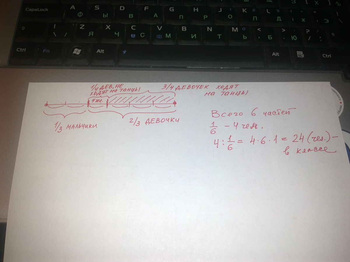 одна треть класса - мальчики. три четвертых всех девочек ходит на танцы. сколько учащихся в классе, если в танцевальный кружок не ходят 4 девочки