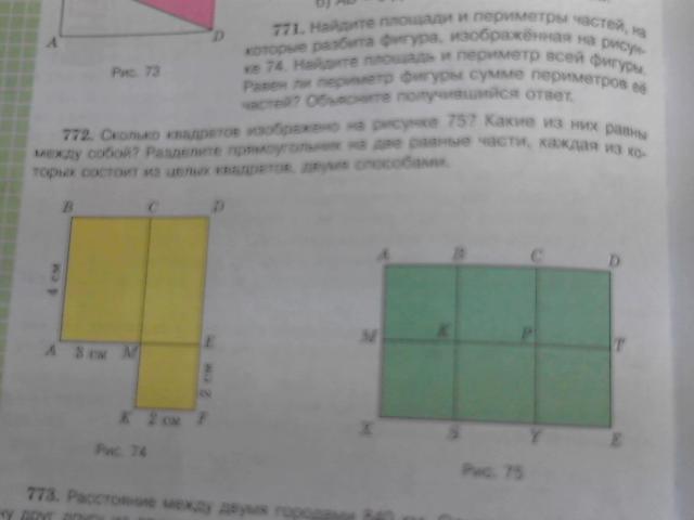 № 772. сколько квадратов изабражено на рисунке 75? какие из них равны между собой? разделите прямоугольник на две равные части каждая из которых состоит из целых квадратов двумя спосабами