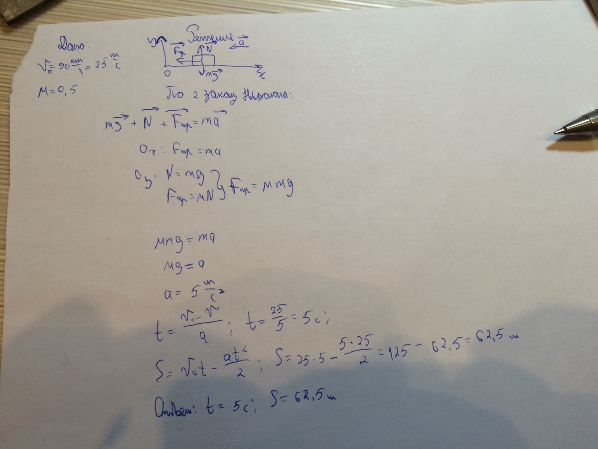 Всем привет!!! Кто хорошо знает физику, помогите!!! Заранее БОЛЬШОЕ СПАСИБО!!!Водитель начал торможение при скорости автомобиля 90 км/ч . Определите время торможения и тормозной путь если коэффициент трения 0,5 .