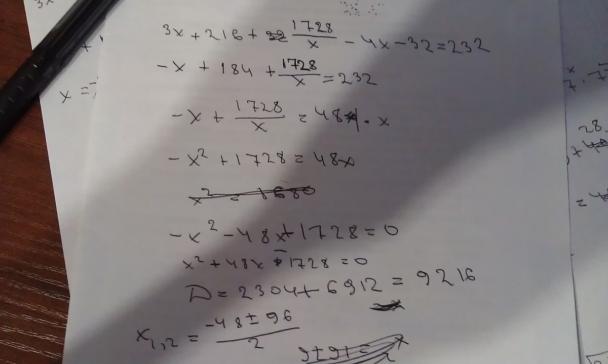 3x+ 216+1728/x-4x-32-232=0 | усножаем все члены на x, получаем