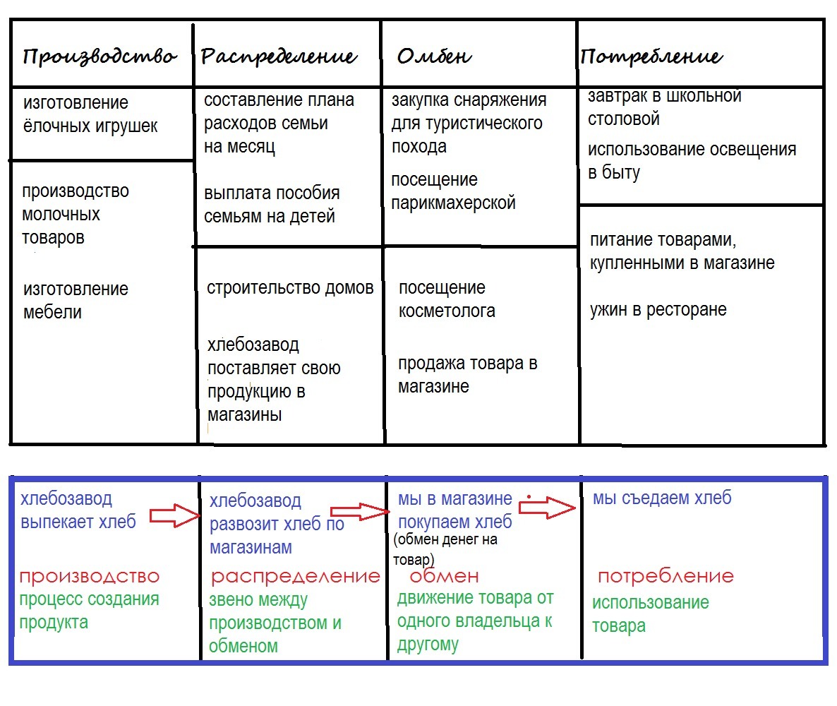 Впиши каждый из перечисленных видов экономической деятельности в соответствующий столбик таблицы: изготовление ёлочных игрушек, составление плана расходов семьи на месяц, завтрак в школьной столовой, посещение парикмахерской, выплата пособия семьям на детей, использование освещения в быту, закупка снаряжения для туристического похода. Приведи по 2—3 собственных примера в каждый столбик таблицы. (Вложения ниже)