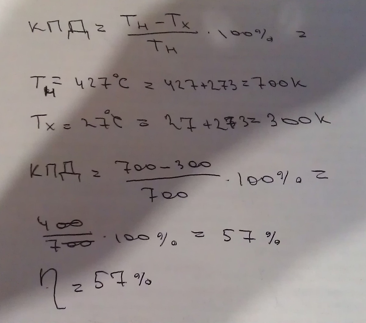 определите КПД идеальной тепловой машины если температура нагревателя 427 градусов С, а холодильника 27 гр.?