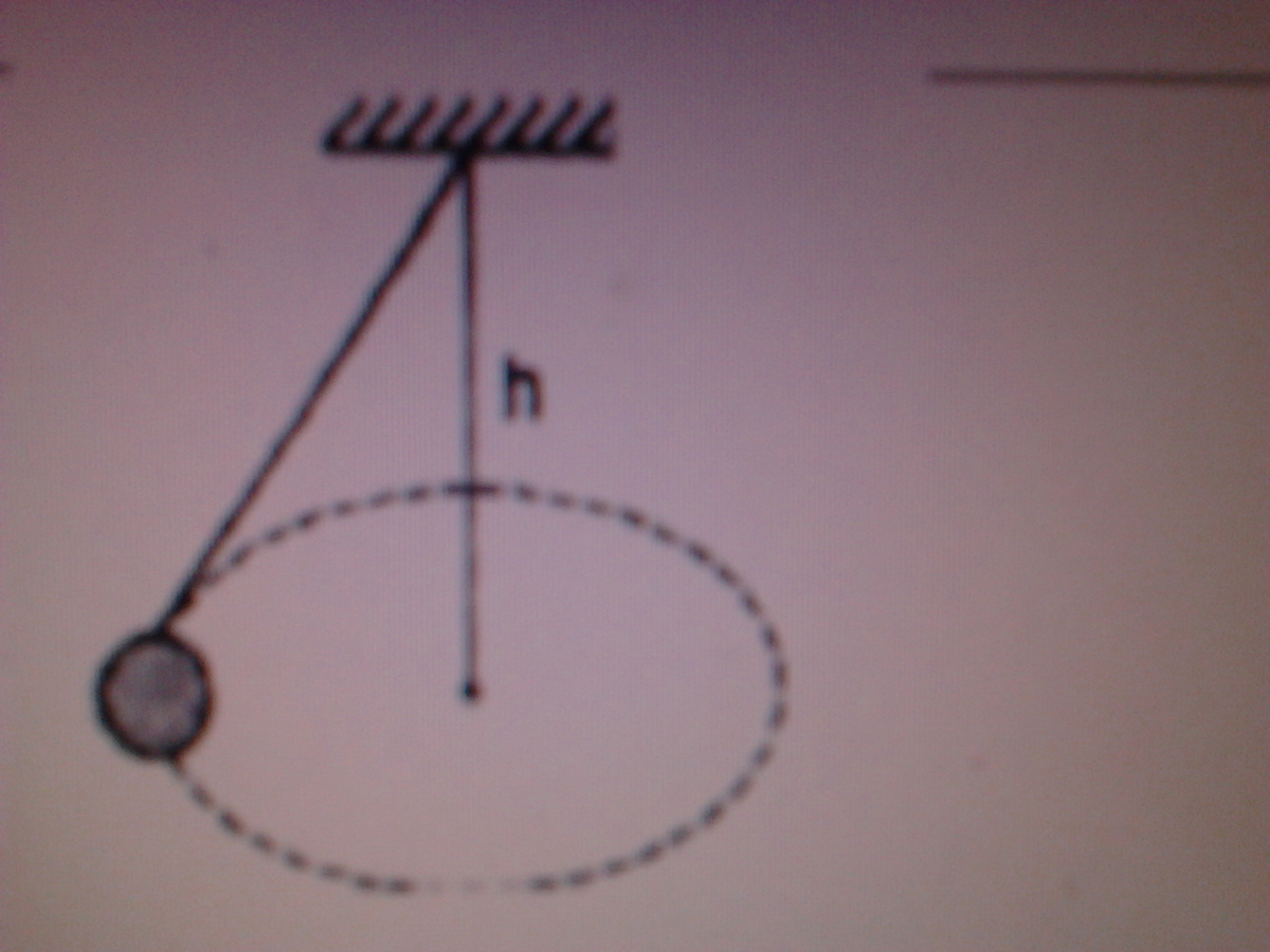 Грузик привязан к нити, другой конец, которой прикреплен к потолку. Грузик движется по окружности, плоскость которой отстоит от потолка на h = 1,5 м. Каков период обращения