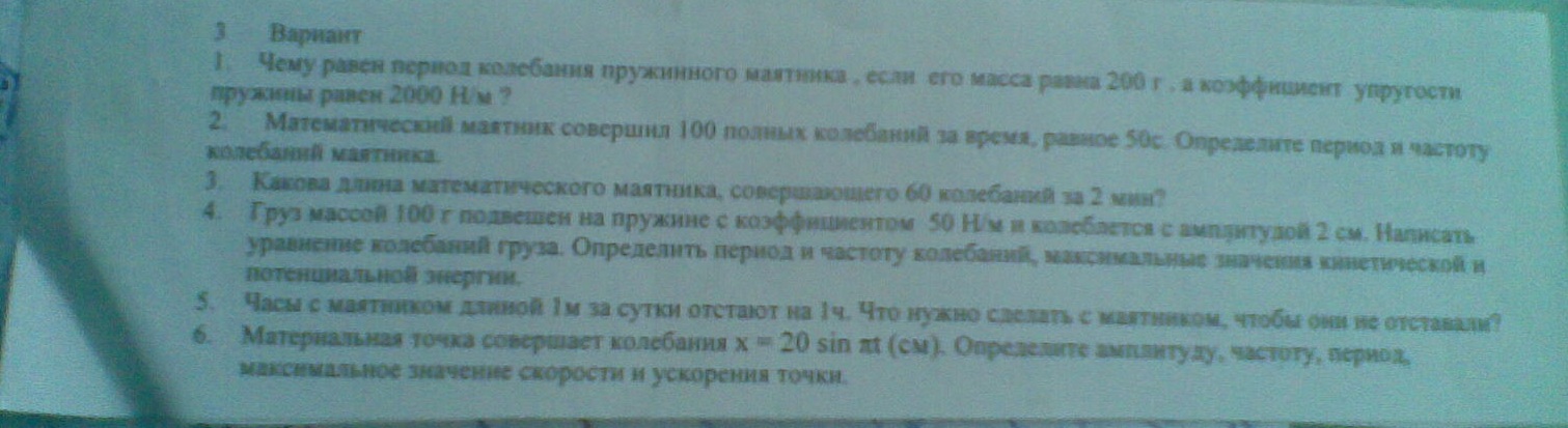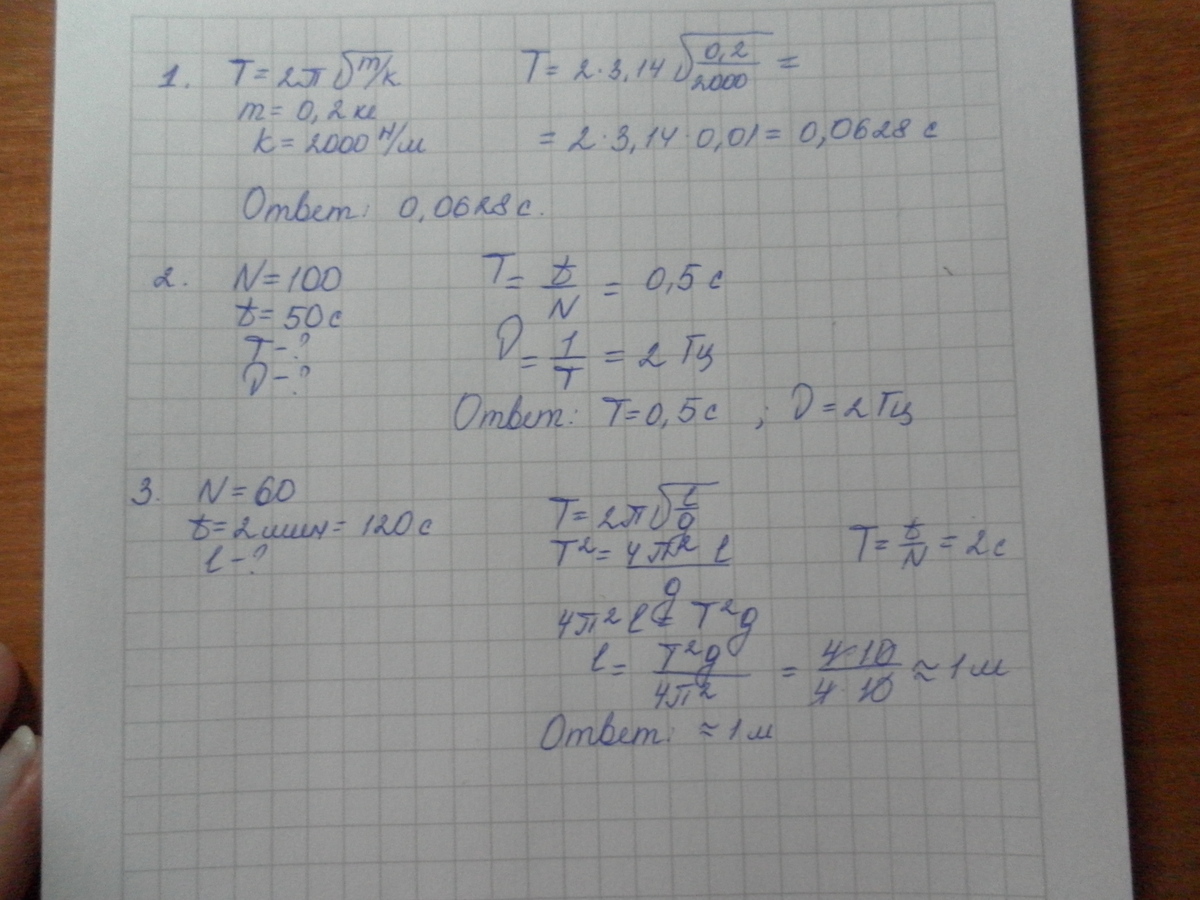 1)Чему равен период колебания пружинного маятника,если его масса равна 200г а коэффициент упрогости пружины равен 2000H/м ?