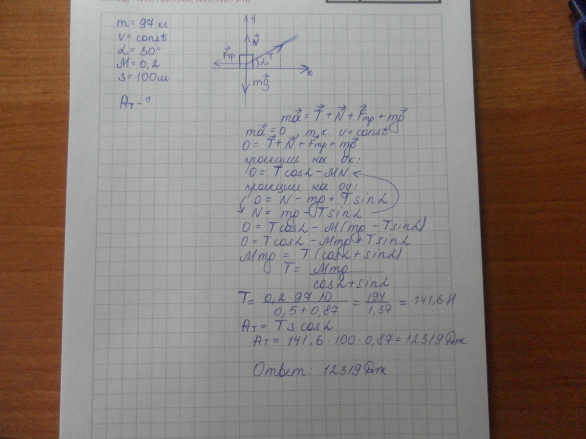 Груз массой 97кг перемещают с помощью веревки с постоянной скоростью по горизонтальной поверхности.Угол между веревкой и этой поверхностью равен 30 градусов.Коэффициент трения равен 0,2.Найдите работу силы натяжения веревки на пути 100 м. С очень подробным решением)