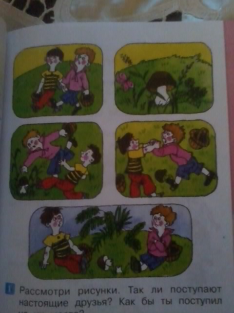 Дима и Саша решили пойти собрать грибы. На полянке стоял красивый гриб. Они пришли на ту полянку и Дима побежал сорвать быстрее тот гриб что бы мама его похвалила, а Саша схватил его и Дима упал. Гриб поломался. Мальчики не заметили этого. Они начали драться. Когда упали друзья заметили что гриб сломался...