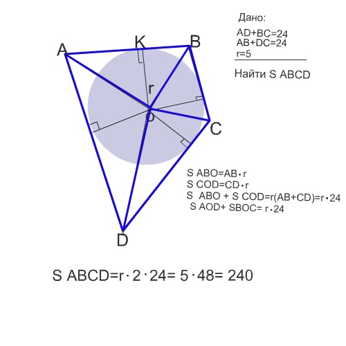 Сумма двух противоположных сторон описанного четырёхугольника и радиус вписанной в него окружности соответственно равны 24 и 5.Найдите площадь четырёхугольника.