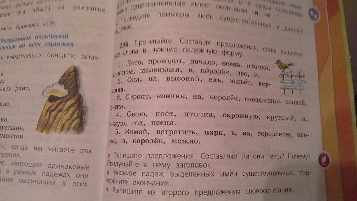 осени -р.п., в лесу- п.п., на вершине- п.п., ели -р.п., на кончике -п.п., ветки -р.п., песню-в.п., королька.р.п., на огороде-п.п., в парке-п.п.