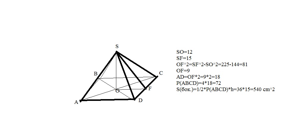 Высота правильной четырёхугольной пирамиды равна 12 см, а апофема- 15см. Вычислите боковую поверхность пирамиды.