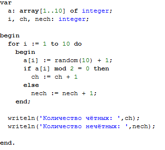 var a: array[1..10] of integer; i, ch, nech: integer; begin for i := 1 to 10 do begin a[i] := random(10) + 1; if a[i] mod 2 = 0 then ch := ch + 1 else nech := nech + 1; end; writeln('Количество чётных: ',ch); writeln('Количество нечётных: ',nech);