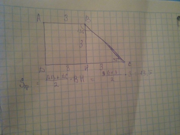 Площадь трапеции равна полусумме оснований, умноженная на высоту. На рисунке написала. так как угол ABC=135, то BCD=45 (их сумма равно 180). А это означает, что Треугольник BHC равнобедренный(он прямоугольный, т.к. BH это наша искомая высота) AB=DH=3 А значит HC=6-3=3 => BH=HC=3. => можно найти площадь трапеции(на рисунке)