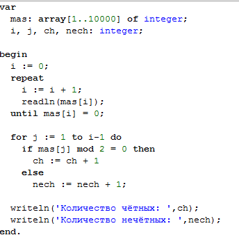 Напишите программу, которая в последовательности натуральных чисел определяет сумму всех четных чисел чисел и количество нечетных. Программа получает на вход натуральные числа, количество введённых чисел неизвестно, последовательность чисел заканчивается числом 0 (0 – признак окончания ввода, не входит в последовательность).