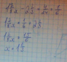1 7/8х - 2 1/3 = 4/24; (4/24 = 1/6)