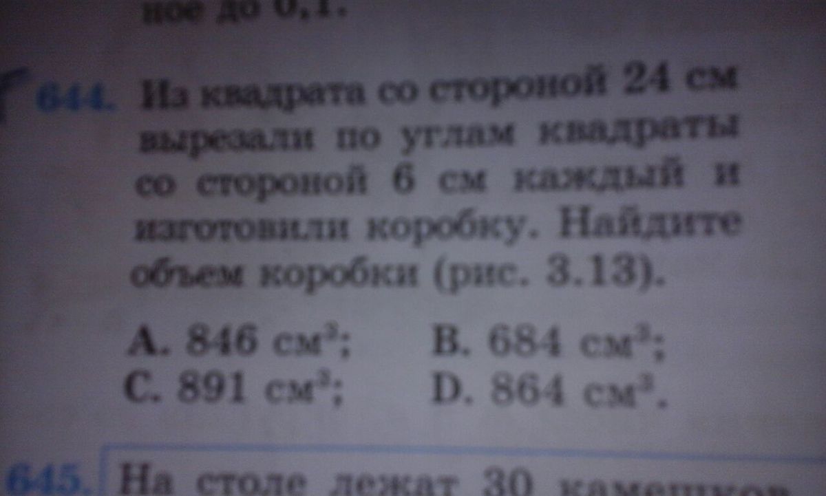 Ответ D=864; вырезали с каждого угла квадрат со стороной 6см. Значит обьем V=a в кубе; V=6*6*6; V=216; а квадрата 4, потому что угла 4 у квадрата что в условии. Значит 216*4=864.