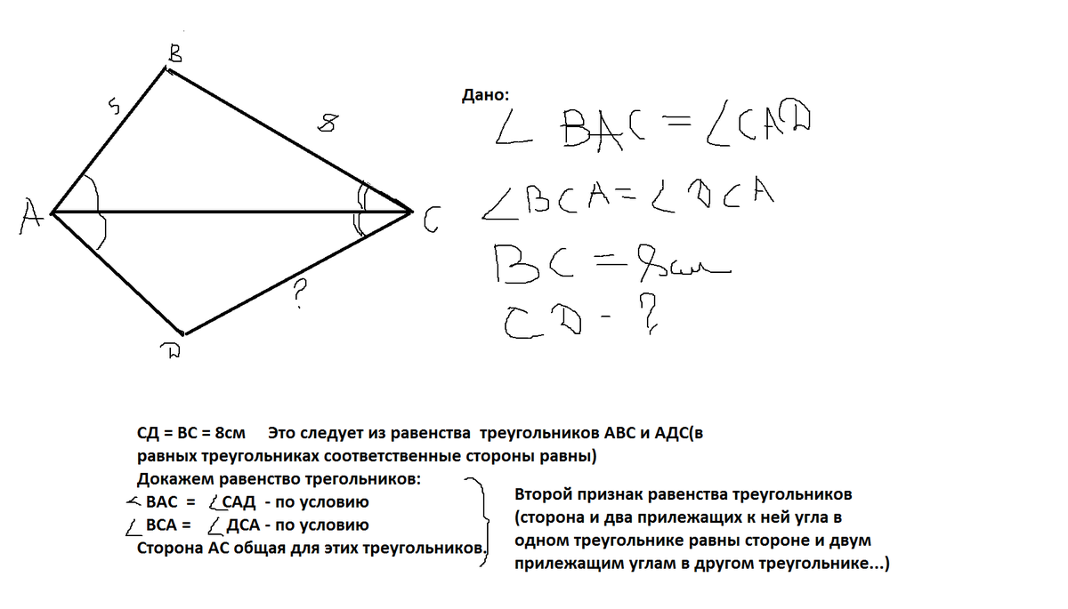 По разные стороны от прямой АС отмечены точки B и Д так , что угол ВАС = углу САД , угол ВСА = углу ДСА . АВ = 5см , ВС = 8 см . Чему равна длина СД? Помогите пожалуйста(((