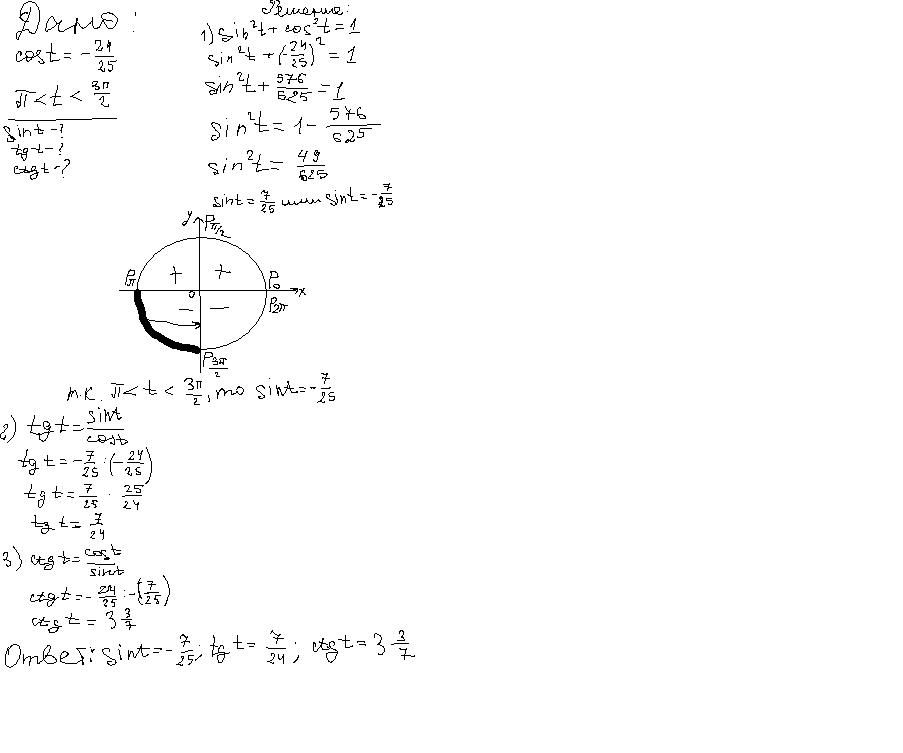 2)Известно, что cos t=-24/25, π<t<3π/2. Вычислите sin , tgt , ctgt