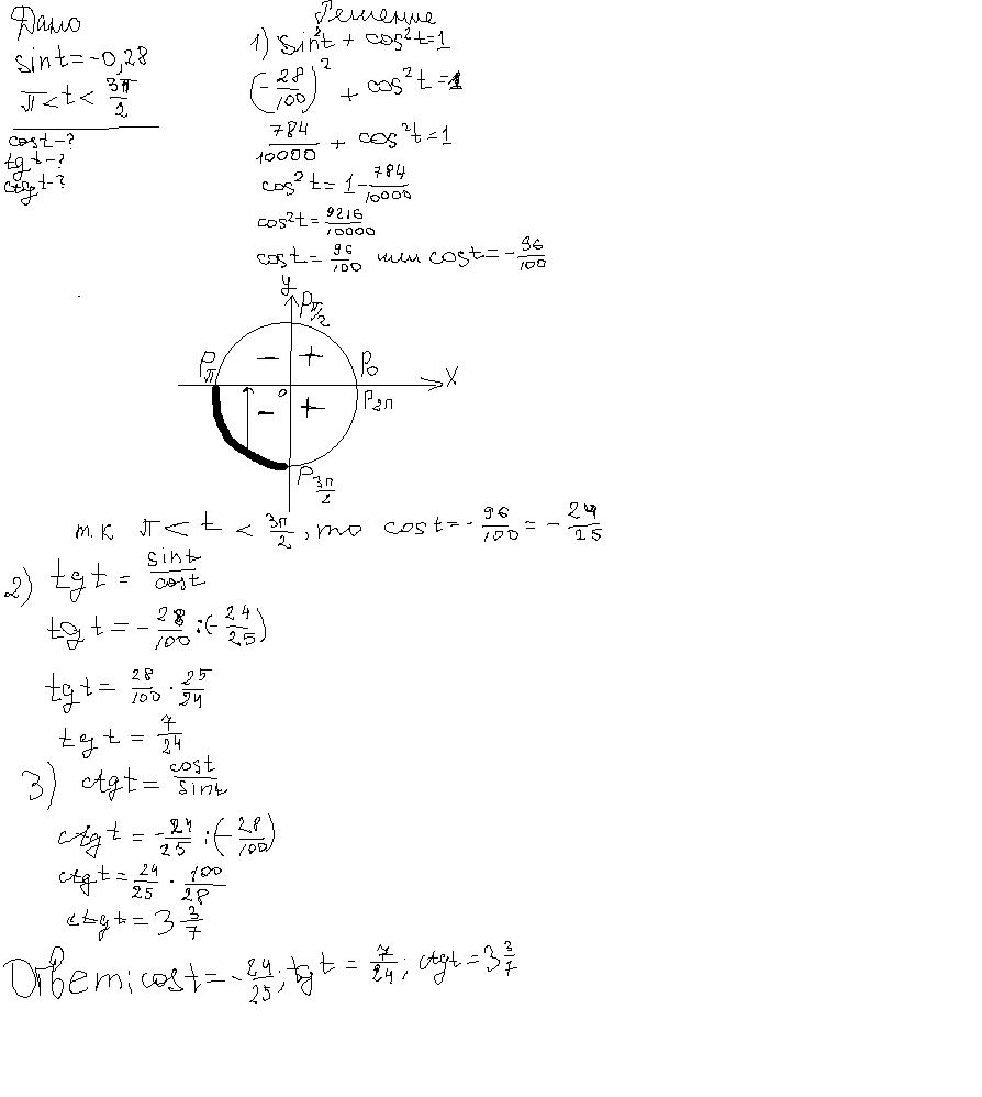 1)Известно, что sin t=-0,28 π<t<3π/2. Вычислите cost , tgt , ctgt.