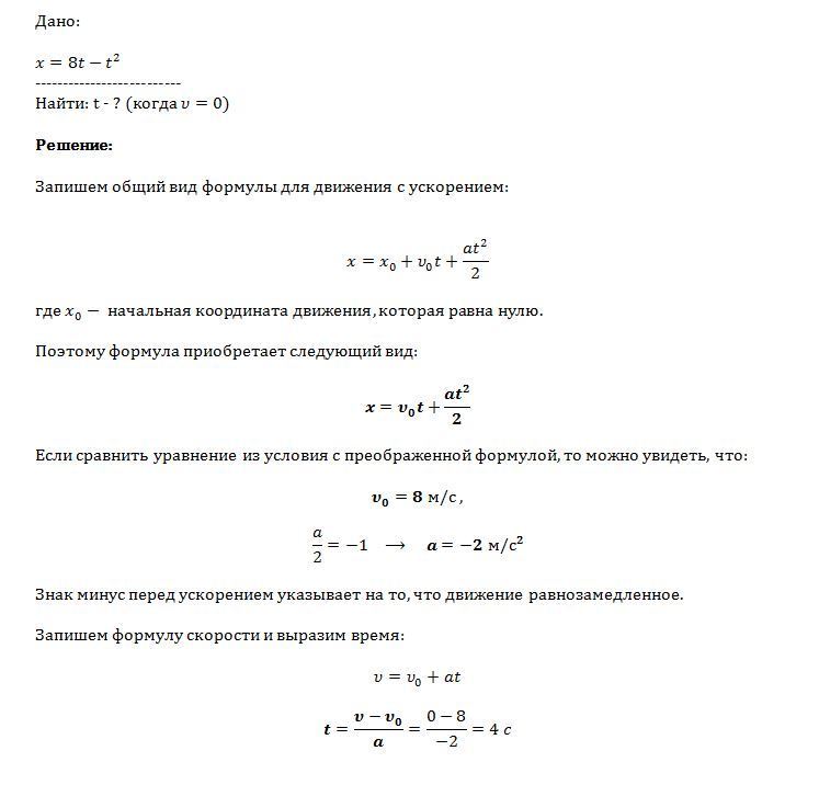 зависимость координаты некоторого тела от времени описывается уравнением x=8t-t*t . В какой момент времен скорость тела равна нулю ?